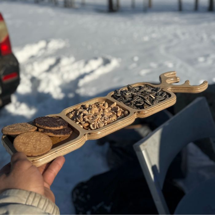 این اردوخوری از چوب طبیعی و باکیفیت ساخته شده که علاوه بر استحکام بالا، حس گرما و اصالت را به محیط منتقل میکند. سه بخش مجزا در سطح اردوخوری طراحی شده که امکان سرو انواع آجیل، تنقلات، شکلات، زیتون و حتی مزههای متنوع را فراهم میسازد. قسمت دستهی آن که به شکل شاخ گوزن طراحی شده، هم ظاهری جذاب دارد و هم امکان جابهجایی آسان را فراهم میکند.